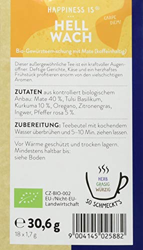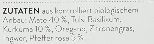 Mate bio (40%) , Tulsi Basilikum bio , Kurkuma bio (10%) , Oregano (Origanum vulgare L.) bio , Zitronengras bio , Ingwer gemahlen bio , Pfeffer rosa bio (5%)