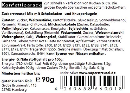 Unser Wertversprechen: Jedweder Zutaten sämtliche Deutschland & EU, gemixt in Hamburg. Einzigartige, Streuselmixe. Durchmischung: Zumal des Transports ruckeln die großen Zuckerstreusel & Schokoperlen meist in die Mitte der Dose. Um die volle Super Streusel-Pracht zu sehen, einfach die Dose in eine größere Schüssel kippen und sich verzaubern lassen.