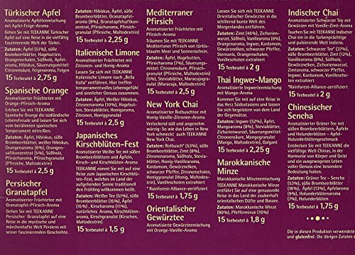 Zutaten: Marokk. Minze: Marokkanische Minze, Pfefferminze# Türkischer Apfel: Äpfel, süße Brombeerblätter, Hagebutten, Orangenschalen, Süßholz, Apfelaroma, Hibiskus, Säuerungsmittel: Citronensäure, Feigenaroma, Feigen# Ind. Chai Classic RFA: Schwarzer Tee, Süße Brombeerblätter, Zimt, Vanillearoma, Süßholz, Gewürznelken, Zichorienwurzel, Zimtaroma, Schwarzer Pfeffer, Ingwer, Kardamom, Vanille-Extrakt# Oriental. Gewürztee: Zimt, Zichorienwurzel, Ingwer, Kardamom, Süßholz, Schwarzer Pfeffer, Sternanis, Steviablätter, Gewürznelken# Spanische Orange: Äpfel, Hibiskus, süße Brombeerblätter, Weißer Hibiskus, Orangenaroma, Orangensaftkonzentrat, Süßholz, Pfirsicharoma, Pfirsichgranulat# Chin. Sencha: Grüner Tee, süße Brombeerblätter, Äpfel, Apfelaroma, Holunderblütenaroma, Holunderblüten# Pers. Granatapfel: Hibiskus, Äpfel, süße Brombeerblätter, Granatapfelaroma, Granatapfelsaftkonzentrat, Pfirsicharoma, Pfirsichgranulat# Jap. Kirschblüten Fest: Weißer Tee, Äpfel, süße Brombeerblätter, Kirscharoma, Kirschblütenaroma, Steviablätter, Kirschgranulat# New York Chai RFA: Rotbusch, süße Brombeerblätter, Zimt, Zitronenaroma, Süßholz, Steviablätter, Honig-Vanillearoma, Kardamom, Gewürznelken, schwarzer Pfeffer, Zitronenschalen, Honiggranulat, Vanille-Extrakt# Thai Ingwer-Mango: Ingwer, Äpfel, Mangoaroma, Steviablätter, Zichorienwurzel, Säuerungsmittel: Citronensäure, Mangogranulat (Mango, Maltodextrin), Galgant# Mediterraner Pfirsich: Hagebutten, Äpfel, Pfirsich-Aroma, Säuerungsmittel: Citronensäure, Pfirsichsaftgranulat, Steviablätter, Passionsfruchtgranulat# Italienische Limone: Äpfel, Weißer Hibiskus, Hagebutten, Zitronenaroma, Steviablätter, Honigaroma, Zitronen, Honiggranulat#