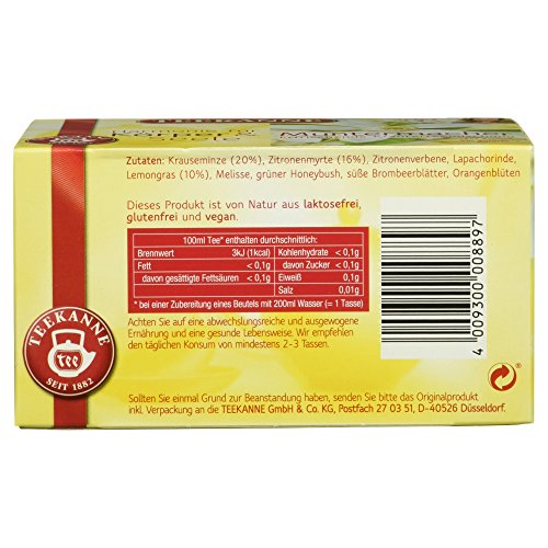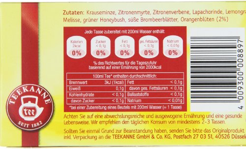 Zutaten: Krauseminze, Melisse, Zitronenmyrte, Zitronenverbene , Grüner Honigbusch, Zitronengras, Süße Brombeerblätter, Oran genblüten