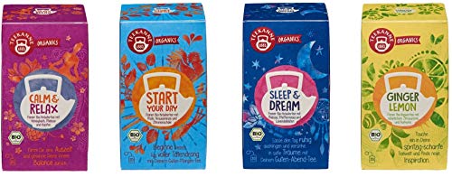 GINGER LEMON: Ingwer (53%)*, Lemongras*, Süßholz*, Kurkuma (5%)*, natürliches Zitrusfrüchtearoma, Zitronenschalen, START YOUR DAY: Lemongras*, Mate (30%)*, Krauseminze (20%)*, Süßholz*, Zitronenschalen*, Steviablätter*, SLEEP AND DREAM: Melisse (40%)*, Zitronengras*, Pfefferminze (21%)*, Süßholz*, Lavendelblüten (5%)*, CALM AND RELAX: Zimt*, Orangenblätter*, Rotbusch*, Süßholz*, Honeybush (8%)*, Kamille*, Melisse (8%)*, Apfelminze*, Pfefferminze*, Lemongras*, Hopfen (5%)*, süße Brombeerblätter*, *ganz kontrolliert biologischer Anbau
