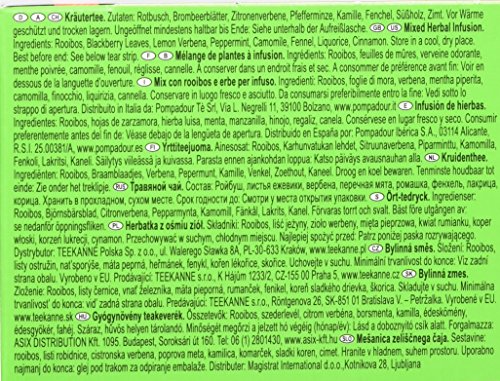 Zutaten: Rotbusch, Brombeerblätter, Zitronenverbene, Pfefferminze, Kamille, Fenchel, Süßholz, Zimt