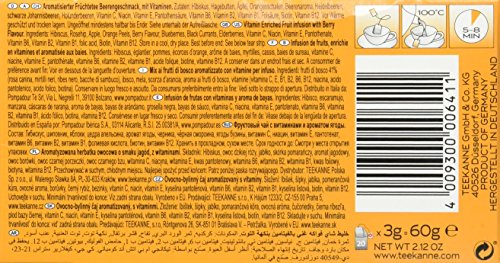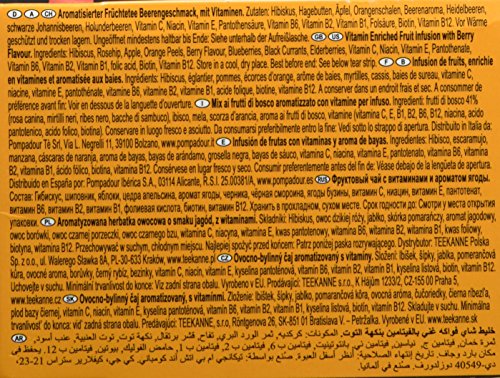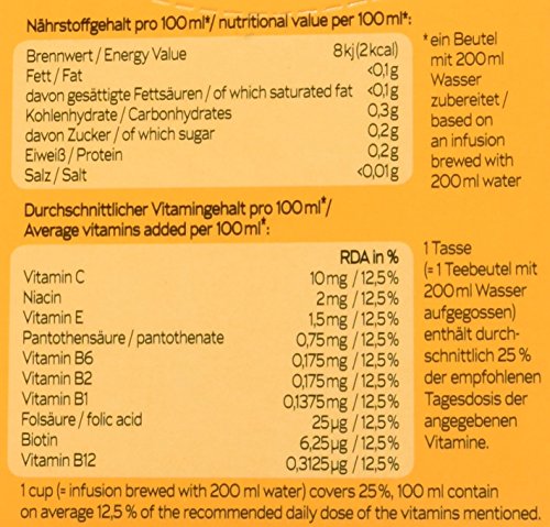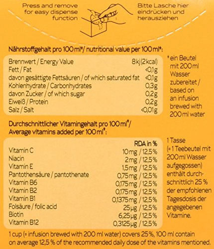 Zutaten: Hibiskus, Hagebutten, Äpfel, Orangenschalen, Beerena roma, Heidelbeeren, schwarze Johannisbeeren, Holunderbeeren, Vitamin C, Niacin, Vitamin E, Pantothensäure, Vitamin B6, Bio tin, Folsäure, Vitamin B1, Vitamin B2, Vitamin B12