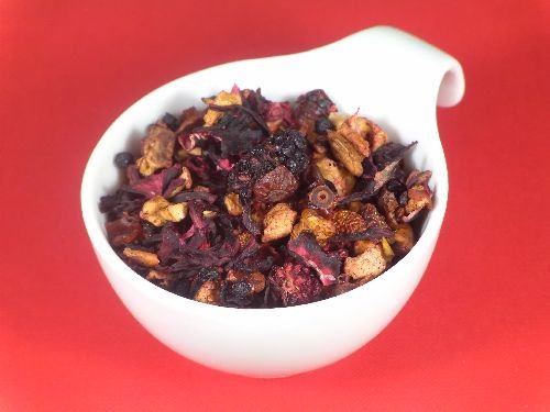 Früchtetee – aromat. Früchtemischung Obstkorb, 1000 g Verfeinerte Rezeptur! Ingredienzen: Apfelstücke, Hibiskusblüten, Holunderbeeren, süße Brombeerblätter, Hagebuttenschalen, Odeur, Cranberryscheiben, Brombeeren, Sauerkirschen, Himbeerstücke