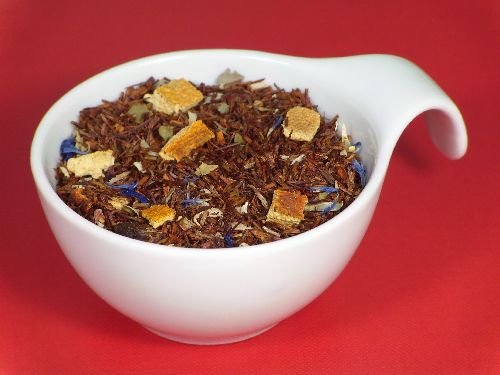 Rooibos Aufgussgetränk – Rooibos Exotic, 1000 g Bestandteile: Rooibos, Kokosnussraspel, Geruch, Orangenschalen, Himbeerstücke, Brombeerblätter, Kornblumenblüten