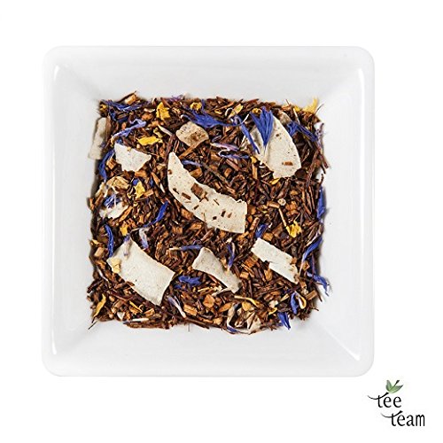 Rooibos Aufgussgetränk – Rooibos Pina Colada, 100 g Verfeinerte Rezeptur! Ingredienzen: Rooibos, Ananaswürfel (Hawaiananas, Zuckerkrankheit), Kokosnuss-Kartoffelchips, Geruch, Sonnenblumenblüten, Kornblumenblüten