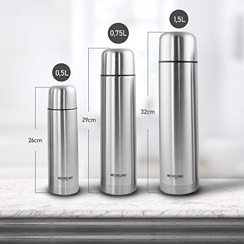TOLLE ISOLIERKANNE AUS ZEITLOSEM DESIGN: Aus qualitativ Hochwertigem Edelstahl sowohl Innen- als vulgo Außengehäuse. Zudem ist die Isolierflasche BPA-Frei. Die Bruchsichere Thermoskanne hält die Innentemperatur für mehrere Stunden aufrecht. Die Thermosflasche hat eine Füllmenge von 0,75 Liter. Maße: Flasche Ø 7,5cm Gesamthöhe mit Becher: 29cm.