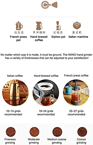 36 Klicks Segment der Mahlstufen— NANO Mahlwerk hat eine Skalenanpassung, Sie können die Skala nach Ihren eigenen Mahlbedürfnissen gleichsetzen, um den gewünschten Geschmack (von super gefühlskalt bis fein) für Espresso, French Press Kaffee zu fertig werden.
