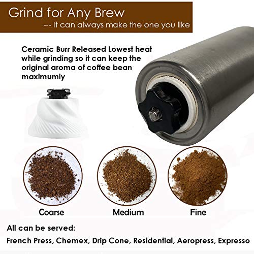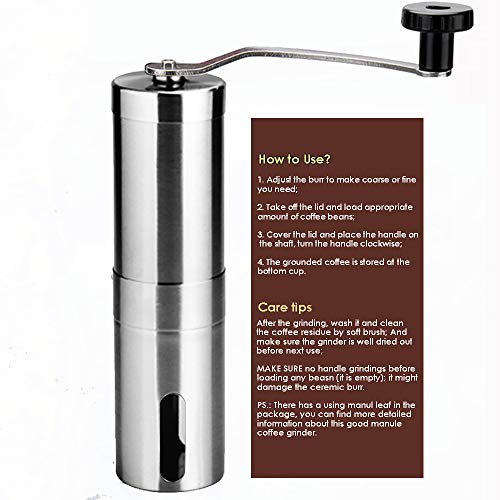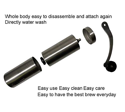 Material: Der Hauptkörper ist aus rostfreiem Edelstahl, der rostfrei ist; der Mahlfräser ist aus Keramik, keine Hitze oder Geruch, da ja Sie mahlen, dies kann Ihnen den reinsten degustieren, den Sie haben wollen, den gemahlenen Kaffee.