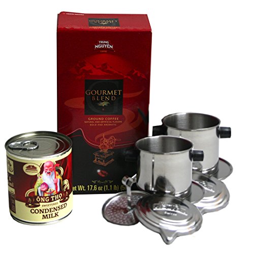– Trung Nguyen Gourmet Blend Kaffeemischung nicht mehr da Vietnam 500g – 2 unverfälscht vietnamesische Kaffeefilter nicht mehr da Edelstahl von Trung Nguyen – 1 Dose Dovgan gesüßte Kondensmilch