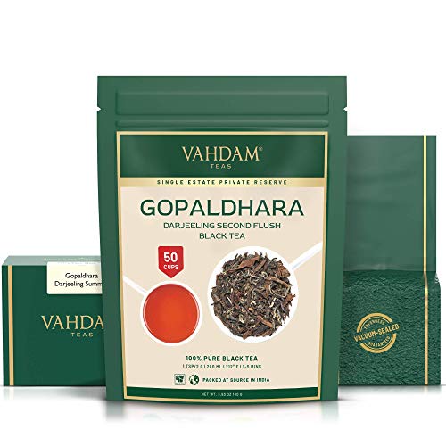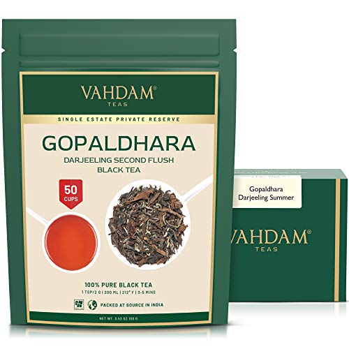 “ erstklassig DRAJEELING SCHWARZER TEE: Gopaldhara Darjeeling zweite FLUSH-Schwarztee ist ein Darjeeling-Muskateller-Tee im Frühstadium mit sauberen und knackigen Noten von getrockneten Aprikosen und Geißblatt.“