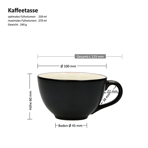 - 6 Kaffeetassen, 230-270 ml, Gesamt-L 12.5 cm, Ø 10 cm, H 6 cm, Boden Ø 4.5 cm, 240 g