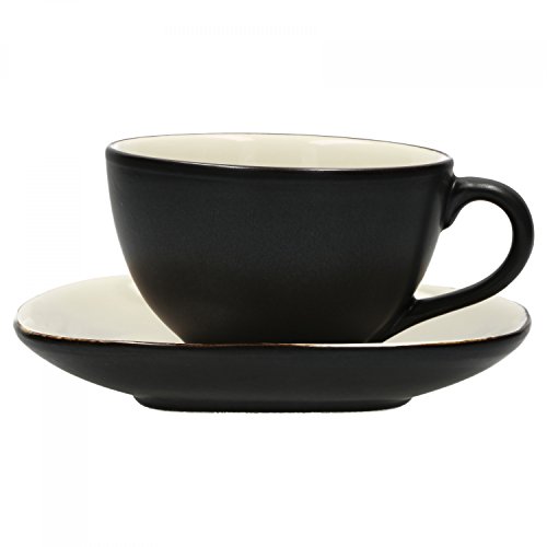 Bis zu 270 ml fassen die 6 cm hohen Tassen, die sich hervorragend zum Anreichen von Kaffee, Tee und anderen Heißgetränken eignen. Ihren Platz finden die trendigen Becher auf den dazugehörigen Untertassen. Die exklusive Tellerform der Untertasse misst an der breitesten Stelle 14 cm und ist 15 cm lang. Der Tassenspiegel misst Ø 5 cm und bietet perfekten Halt für die Kaffeetasse mit einem Bodenmaß von Ø 4.5 cm. Der Henkel hat ein Innenmaß von ca. 2.2 x 3.8 cm.