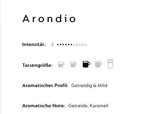 Der Vertuo Arondio ist ein milder Kaffee mit einer runden, sanften Getreidenote. Durch die zarte Säure und die tiefe, feine Intensität hat dieser große schwarze Kaffee einen zugänglichen alphabetisches Zeichen.