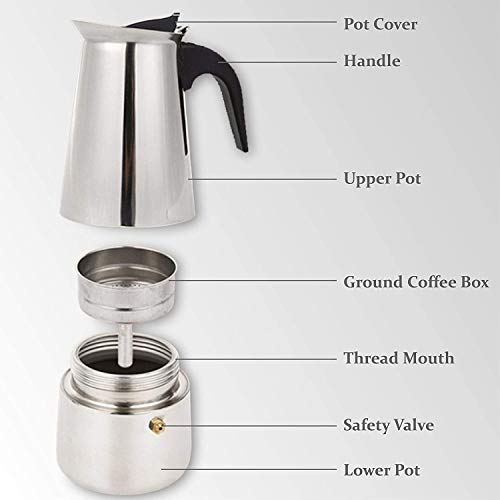Ansprechendes Design: Eleganter Espressokocher-Körper durch Polier-Design, Drei-Ring-Präzisionsgewinde und importiertes Sicherheitsventil, um Ihren Einsatz sicherer zu machen.