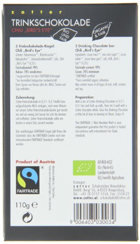 Ganz im Überfluss Chili. Chili „Bird’s Eye“ gilt wie die Urform von Chili u. a. ist wenige Male, feurig u. a. voller Aromen. Diese hochprozentige dunkle Trinkschokolade wird von der Bohne verschütt gegangen im Eigenheim gefertigt u. a. in Tafel gegossen. Ein scharfer Drink, der die Sinne belebt. 110 g Klanggeber über 5 Tafeln TrinkSchokolade à 22 g.
