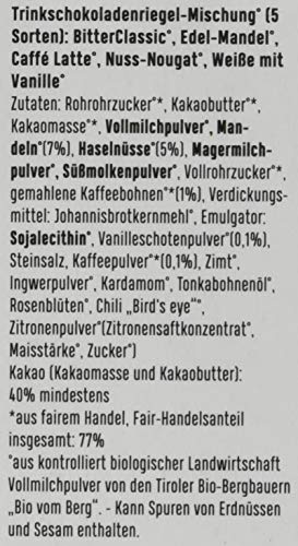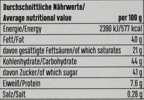 Rohrohrzucker°, Kakaomasse°, Kakaobutter°, VOLLMILCHPULVER°, MANDELN°, HASELNÜSSE°, SÜSSMOLKENPULVER°, Fruktose-Traubenzucker-Sirup°, Vollrohrzucker°, Kaffeebohnen°, MAGERMILCHPULVER°, Johannisbrotkernmehl°, Vanilleschoten°, Emulgator: SOJALECITHIN°, Speisesalz, Kaffeepulver°, Zimt°, Ingwerpulver°, Rosenblüten°, scharfer Paprika „Bird’s eye”°, Zitronenpulver°(Zitronen° & Maisstärke°); Kakao (Kakaomasse u. a. Kakaobutter): 40% mindestens Kann Deklinieren von Erdnüssen u. a. Sesam unterbringen.