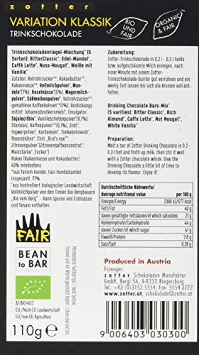 Rohrohrzucker [1]Kakaomasse [1]Kakaobutter [1]Vollmilchpulver [1]Mandeln [1]Haselnüsse [1]Magermilchpulver [1]Süßmolke [1]Vollrohrzucker [1]Kaffeebohnen [1]Johannisbrotkernmehl [1]Vanilleschoten [1]Sojalecithin [2]SalzKaffeepulver [1]Zimt [1]Ingwer [1]Rosenblüten [1]Chili „Bird’s eye“ [1]Zitronenpulver [1] jeglicher kontrolliert biologischer Ackerbau Emulgator